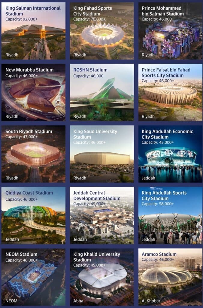Saudi Arabia will host the FIFA World Cup 2034, with 15 stadiums planned across five cities: Riyadh, Jeddah, Al Khobar, Abha, and Neom. The tournament will feature a mix of newly built venues and renovated stadiums, showcasing the Kingdom’s commitment to sports infrastructure and modernization.