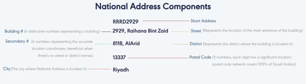 The national address system is a unified standard for locating residential and business addresses across Saudi Arabia. Each address includes: